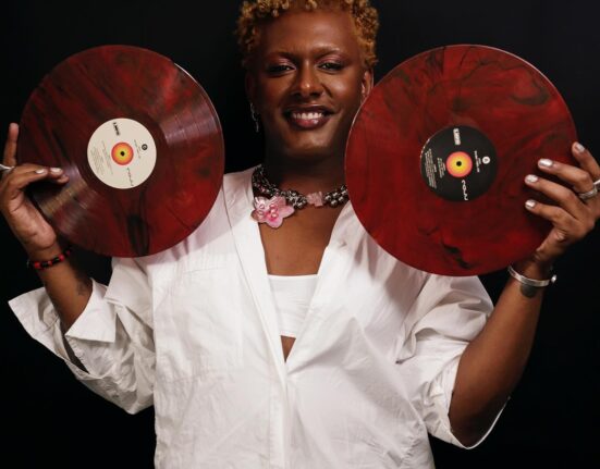 Liniker posa com os vinis de cor marrom mesclado da edição em LP duplo do álbum ‘Caju’, anunciada hoje, 29 de outubro de