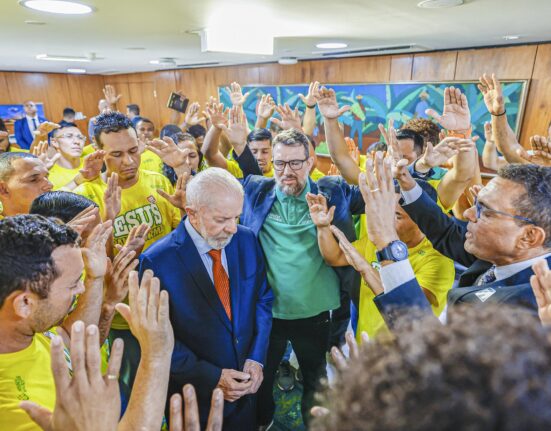 O presidente Lula é rodeado por evangélicos no Palácio do Planalto na cerimônia em que foi criado o Dia da Música Gospel Ricardo
