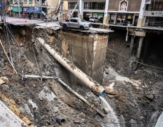 Olha só que coisa! Uma cratera imensa, tipo uns 50 metros de profundidade, se abriu numa avenida super movimentada de Bangkok, na Tailândia,