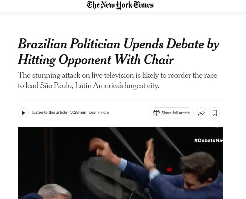 O jornal americano ‘The Washington Post’ e o argentino ‘Clarín’, por exemplo, destacaram o episódio de agressão entre os dois candidatos a prefeito de São Paulo. Datena agride Pablo Marçal com cadeirada durante debate em São Paulo A cadeirada dada por José Luiz Datena (PSDB) em Pablo Marçal (PRTB) durante o debate dos candidatos à