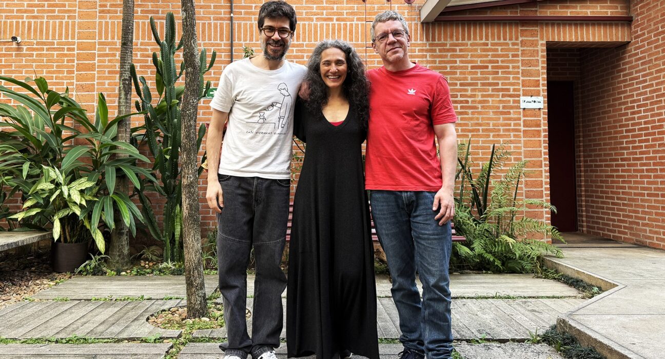 Marcus Preto e Tó Brandileone assinam a produção do disco gravado em estúdio de São Paulo (SP). Badi Assad entre Tó Brandileone (à esquerda) e Marcus Preto, produtores do próximo álbum da cantora, compositora e violonista paulista
