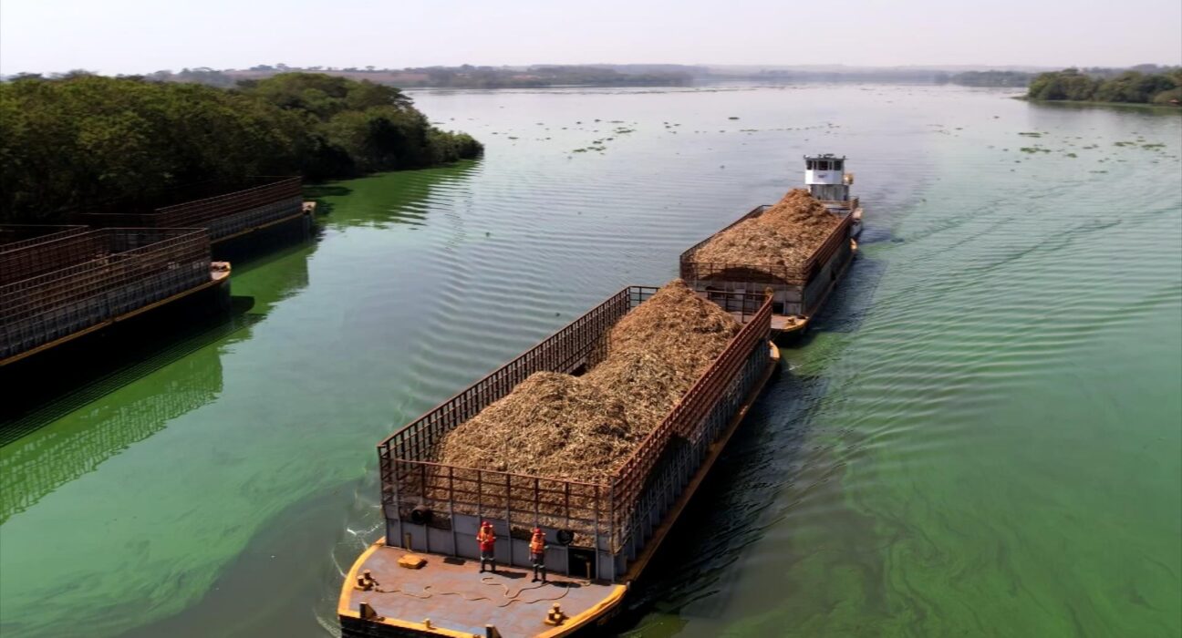 A própria usina gerencia a estrutura e os barcos. Em uma esteira, a cana sai do caminhão e segue para o rio. Cada comboio é formado por três barcaças e, no total, é possível transportar até 1,5 mil toneladas.