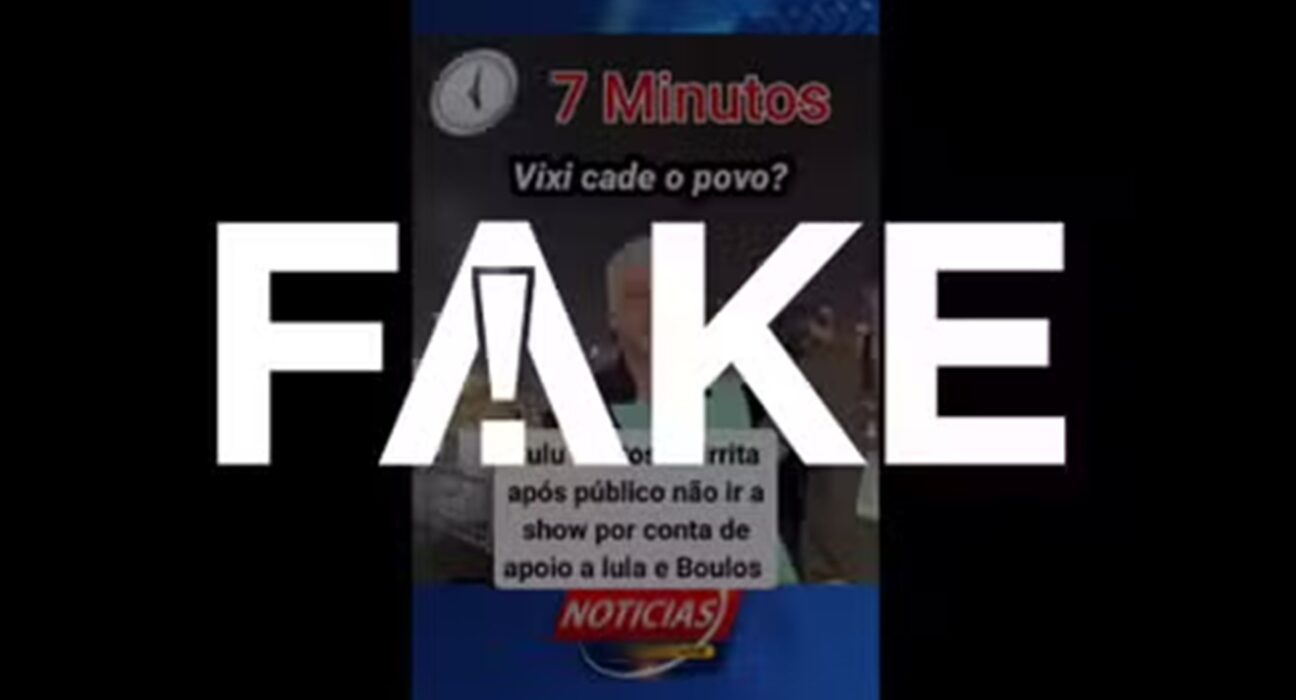 A publicação enganosa mostra o cantor chegando nos bastidores de uma arena e avisando que faltam 7 minutos para seu show começar. A legenda diz: “Lulu Santos se irrita após público não ir a show por conta de apoio a Lula e Boulos”.