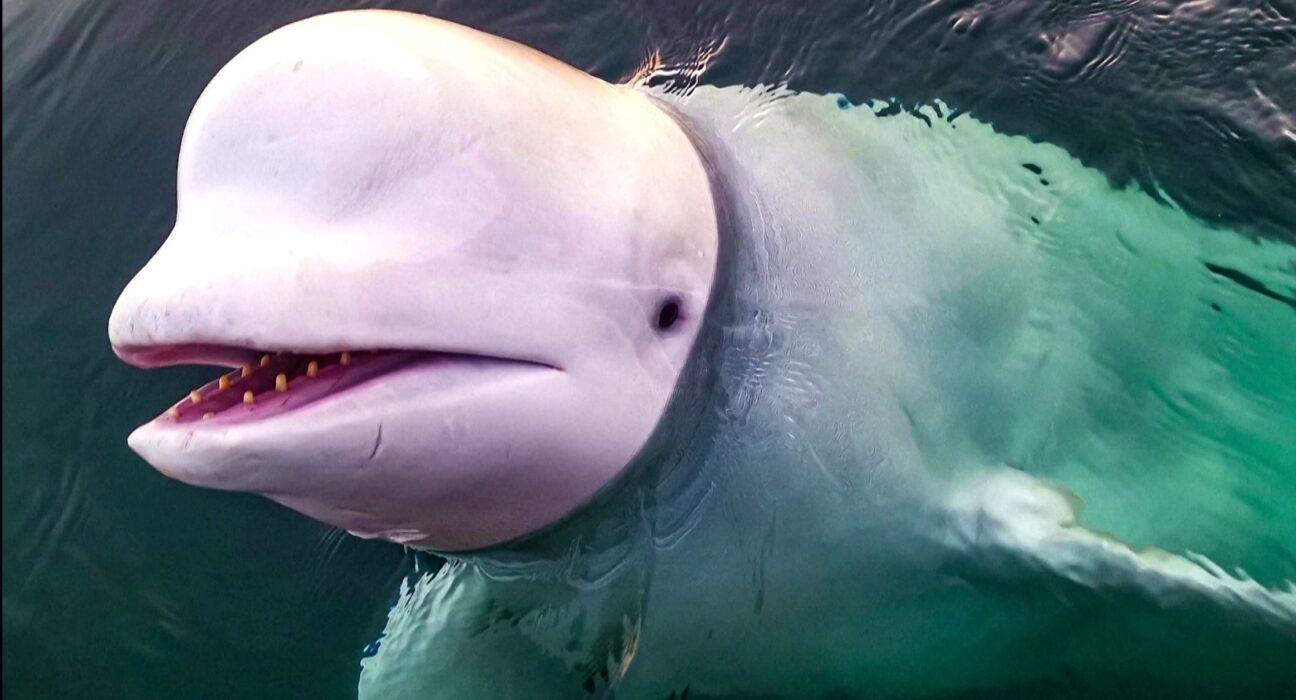 É #FATO: Baleia-beluga 'dá banho' em homem após ele desrespeitar aviso e continuar fumando em área proibida