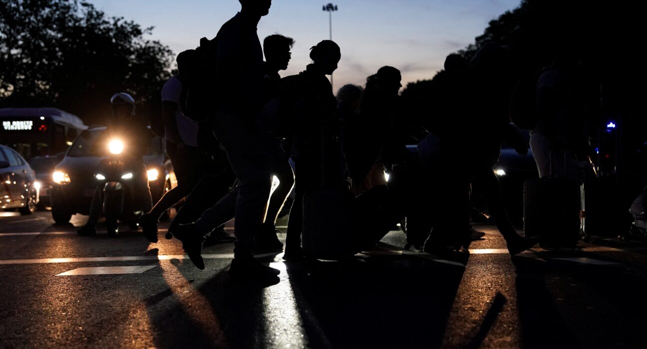 Pessoas atravessam a rua durante apagão em Madri, em 28 de abril de 2025