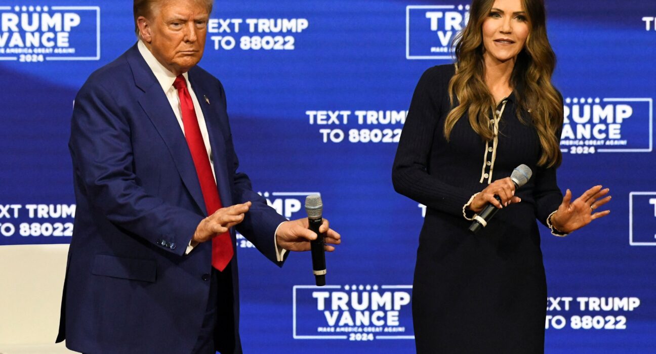 Trump fazendo dancinha no palco ao lado da governadora de Dakota do Sul, Kristi Noem
