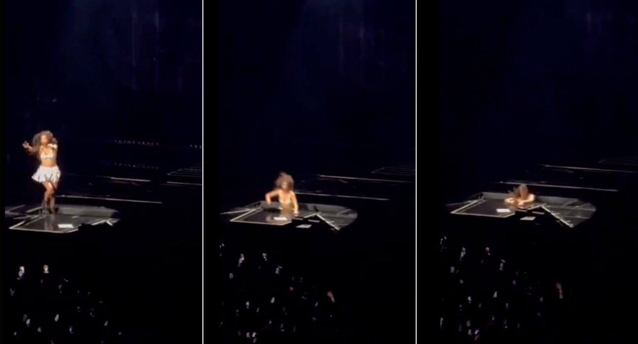“Às vezes tem um buraco no meio do palco”, brincou a cantora com os fãs e seguiu com seu show da turnê “Guts”.