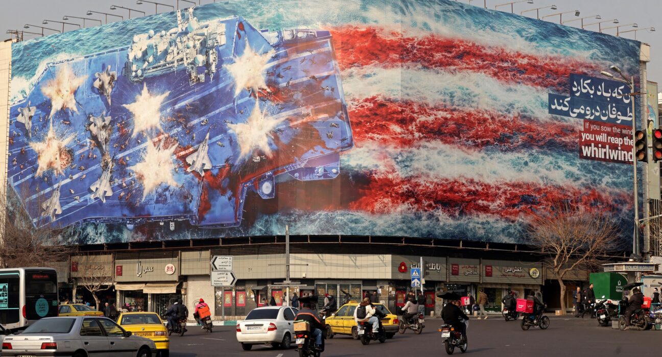 Teerã instala outdoor gigante com porta-aviões bombardeado e manda recado aos EUA: 'Quem semeia vento colhe tempestade'