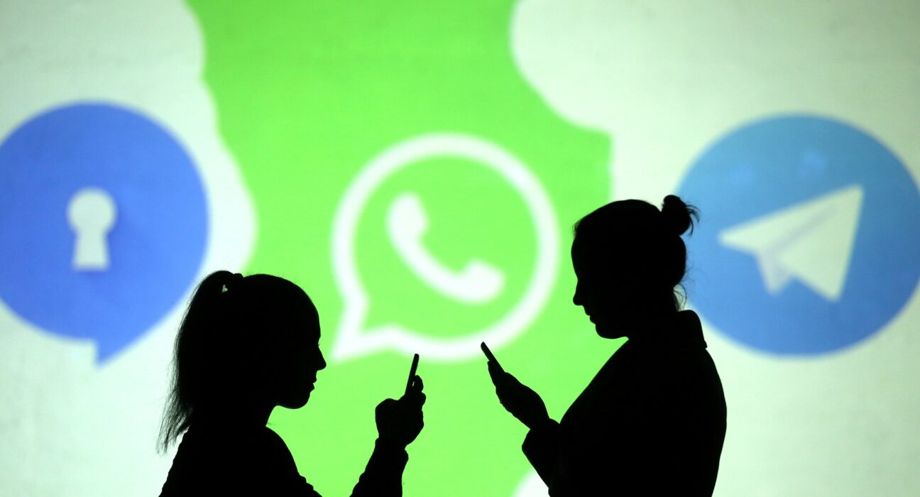 Dados de usuários brasileiros podem ser usados por outras empresas do Grupo Meta, que também é dona do Facebook e Instagram. Pessoas utilizam celulares diante de projeção dos logos do Signal, WhatsApp e Telegram em foto ilustrativa