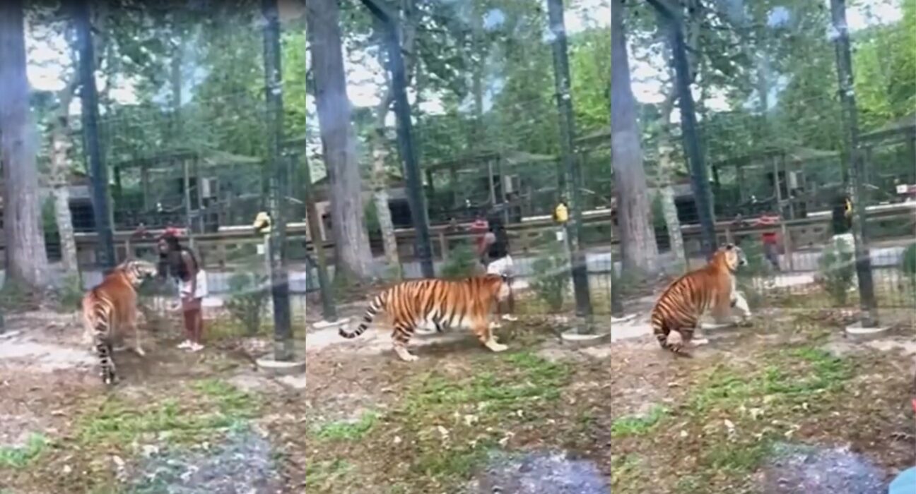 Mulher ‘invade’ jaula de tigre e brinca com animal em zoológico nos Estados Unidos.